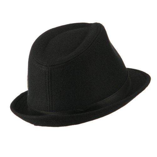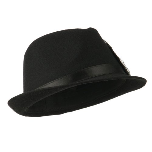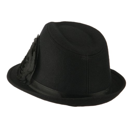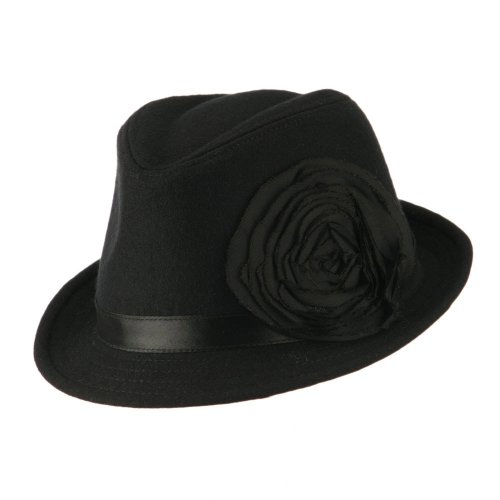 -. Binding : Apparel -. Brand : SS/Hat -. Department : womens -. Feature : Made of 90% polyester and 10% wool. / One size fits most for women, fitting up to 7 1/8. / Inner hatband. / Adult/Female. / Crown measures 4.5 inches deep. -. ProductGroup : Apparel -. ProductTypeName : HAT -. Title : Melton Fedora with Rosette - Black