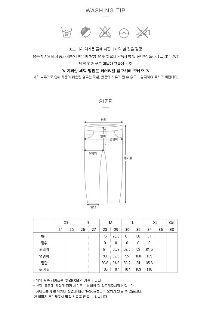 | 되도록 드라이 크리닝 하십시오. 손세탁시 뒤집어 단독세탁 하십시오. 착장시 가방류나 밝은 색상의 의류에 이염 될 수 있으니 주의 하십시오. 반드시 단독 손세탁 또는 드라이 하십시오. 세탁시 탈색의 우려가 있으므로 단독 세탁하십시오. 품질 경영 촉진법에 의한 품질 표시를 꼭 참조하시어 세탁하십시오. 합성세제 세탁시 손상 및 탈색의 우려가 있으므로 미지근한 물에 중성세제로 세탁하십시오. 절대 염소계 표백제로 표백할 수 없습니다. 땀에 젖었을 경우 즉시 세탁하십시오. 심하게 비비거나 비틀어 짜지 마십시오. 물에 10분이상 담가두지 마십시오. 취급부주의로 인한 탈색 및 오염 등 제품의 형태 변질 및 수축된 제품은 보상이 불가능 하오니 주의 하십시요. 취급표시대로 세탁하지 않을시에는 보상받으실수 없습니다. |