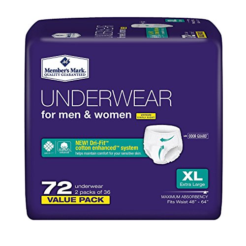 -. Binding : Health and Beauty -. Brand : Members Mark -. Department : unisex-adult -. EAN : 0078742105833 -. Feature : Ideal for heavy incontinence protection / Cloth-like outer fabric with breathable zones / Wetness indicator changes color when soiled / Great protection for both day and night / Fits waist 48" - 64" -. IsAdultProduct : 0 -. Label : Member's Mark -. Manufacturer : Member's Mark -. MPN : 105841 -. PackageQuantity : 72 -. PartNumber : 105841 -. ProductGroup : Health and Beauty -. ProductTypeName : HEALTH_PERSONAL_CARE -. Publisher : Member's Mark -. Size : Medium -. Studio : Member's Mark -. Title : Member's Mark Unisex Protective Underwear Briefs Adult Diaper for Men & Women, X-Large, 72-Count -. UPC : 078742105833