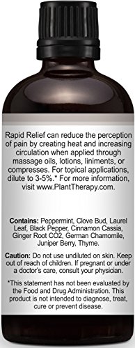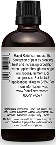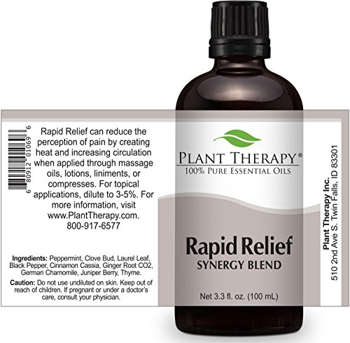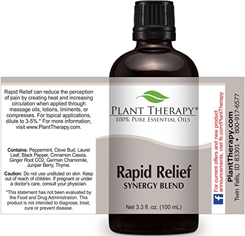 ReleaseDate : 2016-10-29 Studio : Plant Therapy Inc Publisher : Plant Therapy Inc Binding : Health and Beauty Product Description Pain is a common occurrence in everyday life, but with Plant Therapy's Rapid Relief Synergy Blend, you can help relieve the perception of pain. This 100% pure, undiluted essential oil synergy blend includes the highest quality essential oils, which include Peppermint, Clove Bud, Laurel Leaf, Black Pepper, Cinnamon Cassia, Ginger Root, German Chamomile, Juniper Berry, and Thyme. These oils blended together will help warm the area of concern and increase circulation giving you a sense of relief and ease. By adding Rapid Relief to your favorite carrier oil, lotion, liniments, or compress recipes you can be sure to enjoy the relief given from this warming, soothing blend. 0
