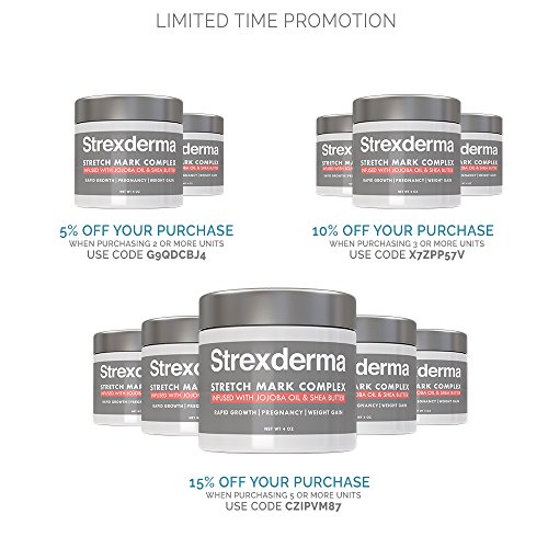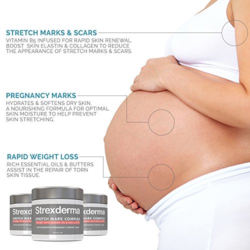 Advanced stretch mark cream & scar removal cream enjoy the many benefits with the best stretch mark cream and scar removal cream Strexderma's custom formula includes high quality ingredients that will help reduce the appearance of both old and new stretch marks. Our perfectly formulated and proven stretch mark and scar cream works on all skin types and skin tones. Our stretch mark cream is specifically formulated for: Stretch mark removal scars removal pregnancy stretch marks weight gain marks rapid growth marks effective organic oils & concentrated butters sunflower oil coconut oil jojoba oil tamandua oil borage oil flax seed oil rose hip oil grapeseed oil macadamia nut oil cocoa butter shea butter vitamin b5 we recommend using Strexderma's stretch mark removal cream before pregnancy/rapid weight gain to increase skin elasticity and prevent new marks forming. Works excellent post pregnancy to reduce and diminish the appearance of stretch marks and pregnancy scars. Our stretch mark removal cream is also designed to increase elasticity and firmness purchase with confidence your satisfaction is our top priority. Our stretch mark cream is always backed by a 100% satisfaction guarantee our stretch mark & scar cream in a nutshell works on all types of stretch marks works on existing and new scars pre/post pregnancy stretch mark cream for both men & women formulated for all skin types and skin tones formulated with natural and organic ingredients.Feature