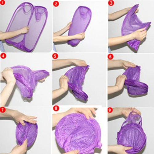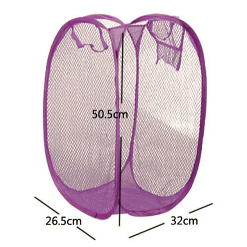 Mesh fabric for ventilation;Easy to open Light weight and easy to carry Folds into pouch for easy when not in use Great for home or travel Ideal for college, camp, apartment dwellers Includes side pocket for carrying supplies Material: Mesh + wire Color: Green.purple.pink.sky blue...(sent the item randomly) Opened Dimension: 30*30*51cm (approx) Weight:90g(approx)