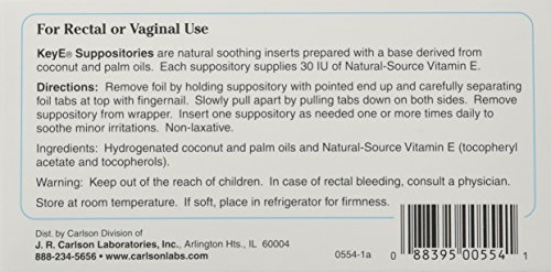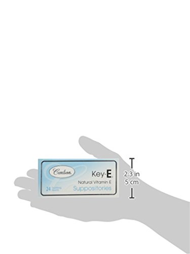 Studio : Carlson Laboratories Publisher : Carlson Laboratories Binding : Health and Beauty Product Description Carlson Labs Key E Suppositories with Natural Vitamin E are natural soothing inserts prepared with a base derived from coconut and palm oils. Each suppository supplies 30 IU of Natural-Source Vitamin E. Studies support the body's preference for Natural Vitamin E, and Carlson All-Natural Vitamin E is derived from soybean oil, a natural food source. Research shows natural Vitamin E to have twice the biological activity of synthetic Vitamin E, and is retained within the body longer. Carlson Natural-source Vitamin E can be used with confidence. On each Carlson Vitamin E label you will find the words: "Independently Assayed to Guarantee. 100% Potency. 100% Natural-Source Vitamin E". 0