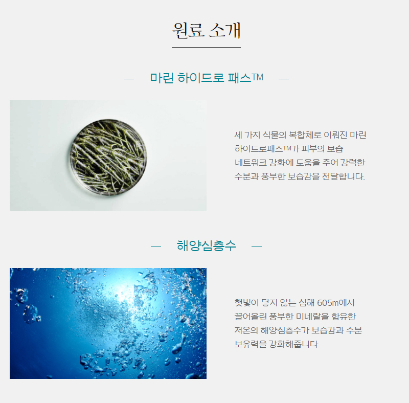 | 605m 해양심층수의 더 깊어진 보습으로 피부 깊숙이 촉촉함을 선사하는 앰플 동해 심층수 포뮬러™로 마린 보습 효능을 제공하여 피부를 촉촉하고 건강하게 가꾸어 주는 수분 공급 프로그램 마린 하이드로 패스™ 거친 파도와 바람에도 본연의 모습을 잃지 않는 마린 식물. 그 강인함의 근원이 되는 마린 하이드로 패스™ 성분이 피부를 더 건강하고 탄탄하게 동해 심층수 포뮬러™ 오랜 마린 바이오 연구로 개발한 동해 심층수 포뮬러™ 기술이 보습 인자와 풍부한 미네랄을 공급 보습 네트워크 식물 바이오 성분으로 세월의 흔적에 따라 감소하는 피부 속 보습 네트워크를 활성화 |