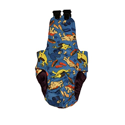 The only completely escape-proof dog diaper overall on the market that is suitable for all dogs including odd-shaped or long-body dogs such as French Bulldogs, English Bulldogs, Dachshund, and Wiener. This diaper overall is designed for "Houdini" escape artists or dogs having difficulty keeping their diapers in place. Built-in suspenders are fully adjustable to get the most comfortable fit for your dog. The extended bottom wing provides complete protection, especially for male dogs. This diaper overall is perfect for dogs excitable urination, incontinent senior dogs, female dogs in heat, male dogs with marking issues. No-tail version available upon request (send us an inquiry after you order to make a request).