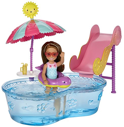 -. Feature : Play out the best backyard stories with outdoor-themed play sets that come with Chelsea doll, a large accessory and smaller themed pieces / The translucent blue pool makes waves with a sun-decorated umbrella that attaches to the side / Fill with water and send Chelsea doll up the ladder and down the colorful slide to make a splash again and again! / An inner tube and smoothie expand the storytelling possibilities / Chelsea doll is ready for fun in the sun in a blue swimsuit, matching ruffled skirt and pink sunglasses