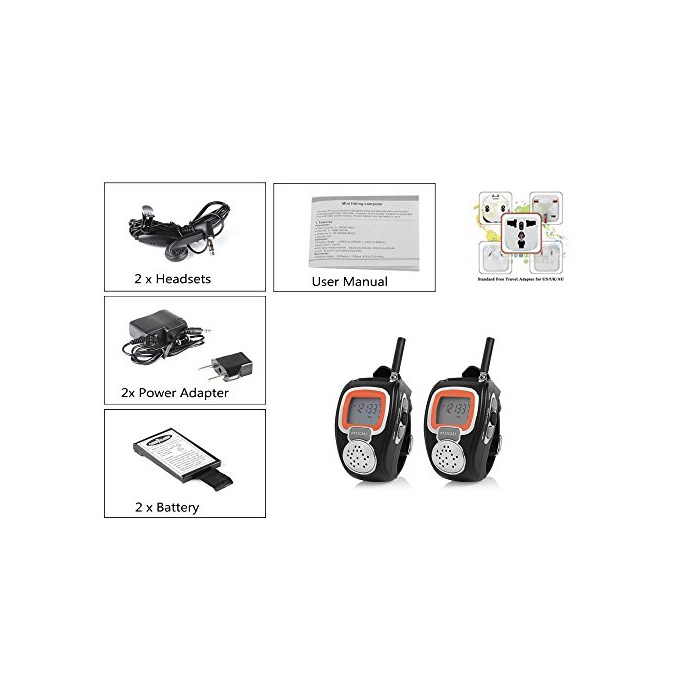 등산,하이킹,공원,쇼핑,콘서트,아웃도어 스포츠,스포츠 이벤트에 사용하는 walkie talkie를 봅니다.walkie talkie에는,핸드프리 옵션의 이어폰/마이크,시간표시,백 라이트 부착LCD,리튬 이온 충전식 배터리,내장 스피커가 포함되어 있습니다.