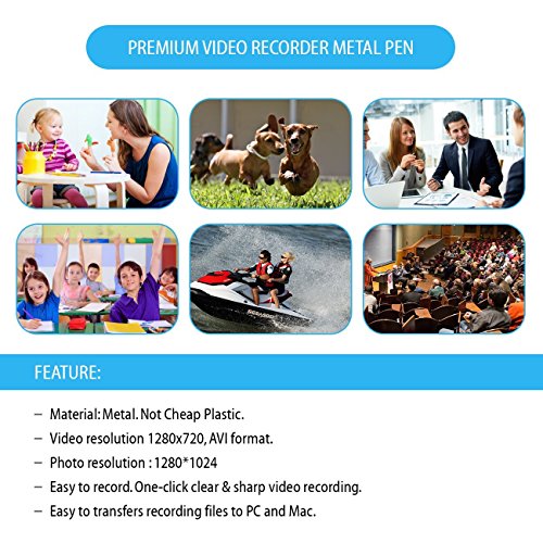 Description Specification: Video Format: AVI Video Resolution: 1280x720 Photo Resolution: 1280*1024 Operating Systems: Windows me/2000/xp/2003/Vista/7, Mac OS X, Linux Charging Voltage: DC - 5V Interface-Type: Mini USB Cable Memory Interface: 4GB SD Card Battery Type: Rechargeable Lithium-Ion Battery Features: Material: Metal. Not Cheap Plastic. Video resolution 1280x720, AVI format. Photo resolution : 1280*1024 Easy to use, One-click clear & sharp video recording. Easy to transfers recording files to PC and Mac. Package Content: 1 x Video Recorder Metal Pen 1 x Charging Cable 1 x User Manual Arthur: Angela
