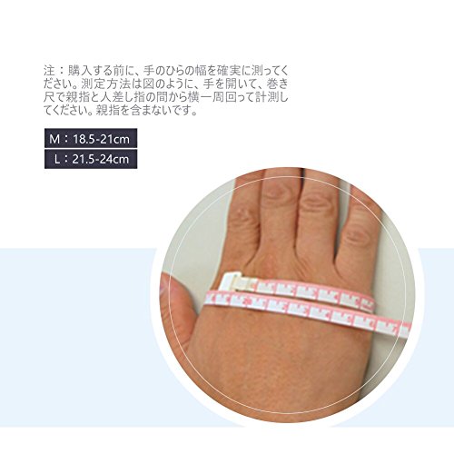 구입 하기 전에,손바닥의 폭을 확실히 재어 하십시오.측정 방법은 그림과 같이,손을 열고, 줄자에 엄지와 집게 손가락의 사이부터 횡일주 돌아 계측해 하십시오.엄지를 포함하지 않습니다.크기 M:18.5cm-21cm,L:21.5cm-24cm