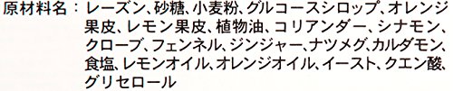 原材料:干しぶどう、砂糖、小麦粉、果皮砂糖漬(水あめ、オレンジ果皮、砂糖、レモン果皮)、植物油脂、スパイスミックス、食塩、イースト/グリセリン、香料pH調整剤