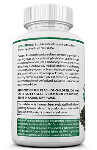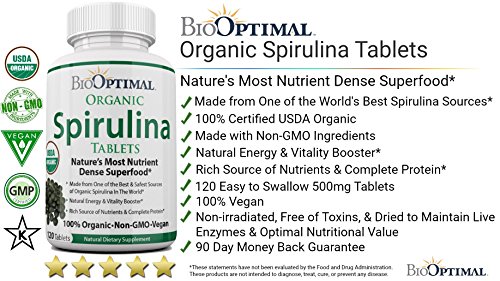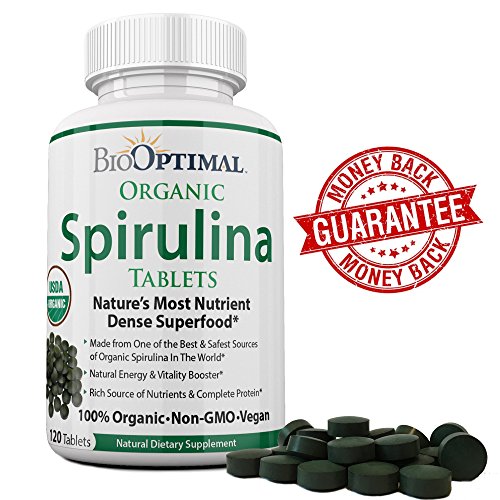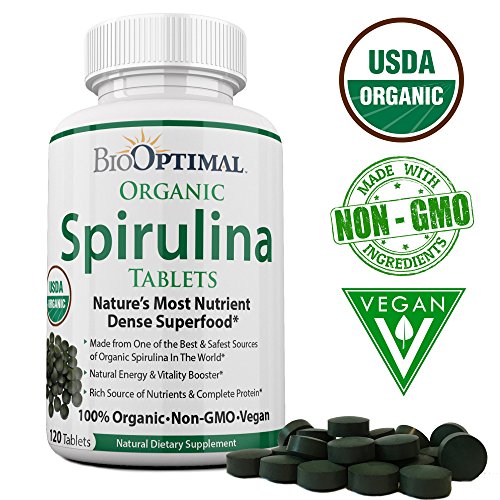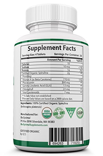 -. Binding : Health and Beauty -. Brand : BioOptimal -. EAN : 0694263718255 -. Feature : ORGANIC SPIRULINA: Made from 100% USDA Organic Spirulina, 120 Easy-to-Swallow 500mg Tablets / WORLD'S BEST SPIRULINA: Only source of spirulina certified organic by USDA, EU, Naturland & Ecocert / 100% PURE ORGANIC SPIRULINA SUPPLEMENT: Our USDA Organic Spirulina Tablets are Non-GMO & Vegan with no capsules or fillers / SUPERFOOD: Nature's most nutrient dense superfood with wide spectrum of vitamins & minerals / SATISFACTION GUARANTEED: Contact us within 90 days of your purchase for a full money back guarantee -. IsAdultProduct : 0 -. Label : BioOptimal -. LegalDisclaimer : Disclaimer: These statements have not been evaluated by the Food and Drug Administration. These products are not intended to diagnose, treat, cure, or prevent any disease. We recommend that you do not rely solely on the information presented and that you always read labels, warnings, and directions before using or consuming a product. -. Manufacturer : BioOptimal -. MPN : OST -. PackageQuantity : 1 -. PartNumber : OST -. ProductGroup : Health and Beauty -. ProductTypeName : HEALTH_PERSONAL_CARE -. Publisher : BioOptimal -. Size : 120 Tablet Bottle -. Studio : BioOptimal -. Title : BioOptimal Organic Spirulina, 100% USDA Organic Spirulina Tablets, Premium Quality, Non-GMO, 120 Count, Certified Organic, Easy-to-Swallow, No Capsules or Fillers, Vegan, Superfood -. UPC : 694263718255