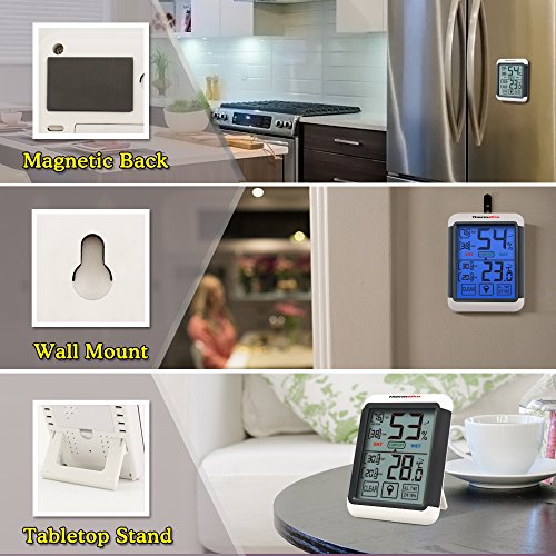 Equipped with professional grade sensors, the ThermoPro TP-55 provides most accurate measurements, be it for humidity or temperature, allowing you to be aware if adjustments are necessary for your household. The TP55 is not just highly accurate but extremely user friendly with a backlight for those nighttime last minute checks on current readings before bed. That's not all, no longer will it be necessary to unmount the device off your wall or fridge to switch settings, simply use the touchscreen display. Furthermore, it provides an abundance of valuable information, such as displaying 24 hour/all-time high/low records and current trends for both humidity and temperature and humidity level icons that indicate if your home is too humid, too dry or just right!