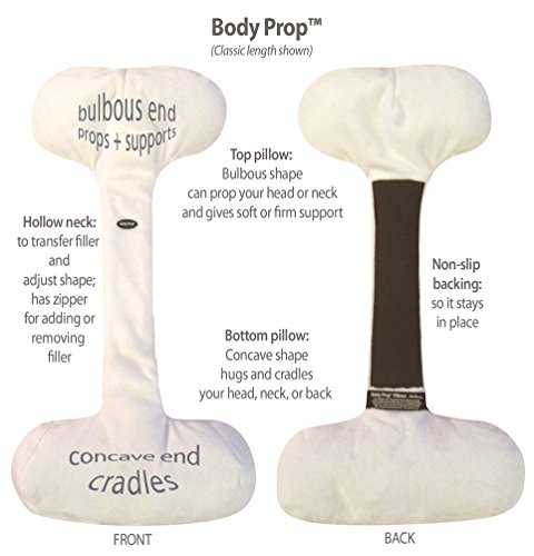 Studio : VisionX Products LLC Publisher : VisionX Products LLC Product Description PLEASE NOTE: The small icon showing color variations may be showing the LONG Body Prop instead of the CLASSIC. When ordering, please ensure you are ordering the length you intended. We apologize for any confusion and hope to resolve this icon issue soon. Fill the void of space behind your head, neck, or back on almost any seat with this highly-adjustable and customizable support device. Patented design allows for custom adjustments on-the-fly. Rest your head against the bulbous (top) end of the pillow for firm support for alert activities like reading, driving, conversing, or watching television. Or use the concave (bottom) end of the pillow behind your head or neck for more relaxed support, like resting or napping. For lumbar support, use the concave end of the pillow for support that's shallow at the center and flared at the sides, like a traditional lumbar pillow. After selecting your pillow-end, you can further customize the support by transferring the loose filler to make it more or less full. Once you position it, Body PropTM stays in place because of the non-skid backing, along with the counterweight effect of the pillows. Two sizes to choose from: Classic (26") and Long (38"). Body Prop is the redesigned and re-branded version of our original products, Headbone® and BackboneTM (collectively called BoneTM pillows, which are discontinued and sold out). You can search Amazon for those products and corresponding reviews. Manufactured in USA using Silky Minky fabric from Korea. Non-skid (PVC coated knit poly) and zipper made in USA. Package printed in USA. Buckwheat hulls from USA. One-year unconditional satisfaction guarantee. 0