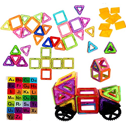 -. Feature : Magnetic Building Blocks for Kids with Totally 52pcs: including 15*square,12*triangles,4*wheels,2* wheel connecting boards,16*letter board,1* storage box,1*instruction / Magnet Building Tiles-Brilliance Magnetic Shapes in Square and Triangle with Random 2 Sides Colorful Design Attract All aged Boys Girls Preschoolers Free Combination to Develop Brain. / Magnetic Blocks BPA Free ABS Material-Plastic ABS material is washable and durable. / Building Tiles with fortified smooth plastic frame-Protect Kids Hands from hurt when playing. / Super Strong Magnets-the greatest base to open the imagination and build creativity for discovery kids.