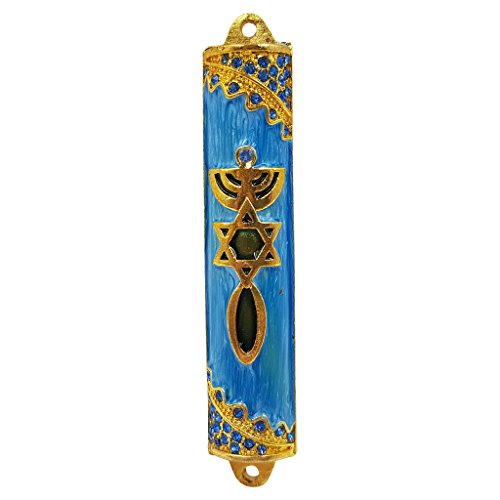 - Messianic Seal Mezuzah Case with Scroll For Door Blue Enamel & Crystals Mezuzah From Israel Judaica Gift 8 cm