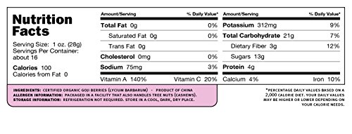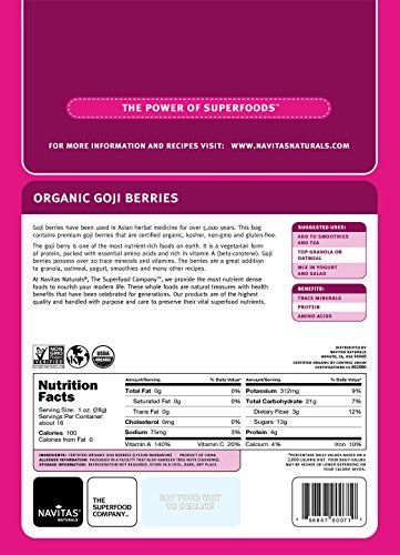 ReleaseDate : 2006-04-18 Studio : Navitas Naturals Publisher : Navitas Naturals Binding : Grocery Product Description Goji berries have been enjoyed for over 2,000 years in Traditional Chinese Medicine. Navitas Naturals Goji Berries can be eaten by the handful, and they provide a superfruit boost to oatmeal, cookies, trail mix and more. A surprisingly strong source of protein, goji berries also contain a wealth of antioxidants and over 20 vitamins and minerals. 0