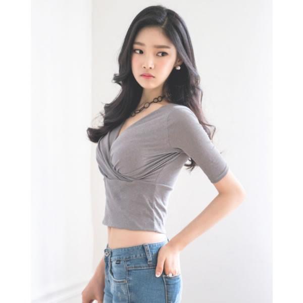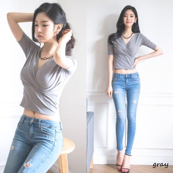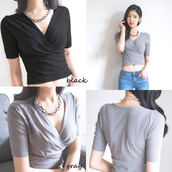 | カシュクール 深Vネック ショート丈 カットソー トップス gray black 黒 無地 【カシュクール Vネック トップス レディース 女性 ロンデルブラック セクシー カットソー トップス ギャザー vネック Tshirt】 | |