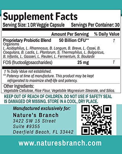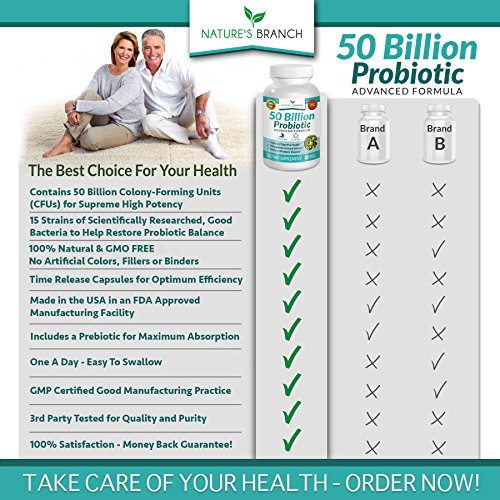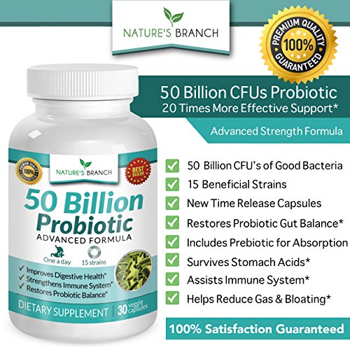 ARE YOU FEELING BLOATED, SLUGGISH, CONSTIPATED OR TIRED? It's time to switch to Nature's Branch 50 Billion Probiotic supplement with Prebiotics - Our advanced Probiotic is carefully researched and uniquely formulated with premium grade, raw ingredients to provide you with the perfect digestive health supplement*. With the most effective, scientifically proven strains, superior CFU live cultures and Prebiotic for enhanced digestion and absorption, you can be rest assured that Nature's Branch is your best choice to help assist and restore your body's natural balance, gastrointestinal tract and immune system. Nature's Branch Highest Potency 50 Billion CFU Probiotic contains a range of exclusive benefits to help support your body: •✔ 50 Billion CFU's Per Capsule •✔ Improves Digestive Health* •✔ Strengthens Immune System* •✔ Restores Natural Balance* •✔ Reduces Gas and Bloating* •✔ Survives Stomach Acids* •✔ Promotes Healthy Bowel Movements* •✔ Unmatched Probiotic Formula with 15 Strains* •✔ Includes Prebiotic for Enhanced Digestion & Absorption* •✔ Supports Brain Function & Heart Health* •✔ Increases Energy and Metabolism* •✔ Boosts Mood and Wellbeing* •✔ Shelf Stable - No Refrigeration Required •✔ One a Day - Vegetarian Friendly •✔ Third Party Tested •✔ Proudly Made in the USA Did you know that 80% of your immune system is found right in your gut? That's why our Probiotic contains the maximum strength 50 Billion CFU's of good bacteria per capsule. Designed specifically for men, women and kids, our advanced Probiotic contains a variety of concentrated and hand selected strains not found in other probiotics.Feature