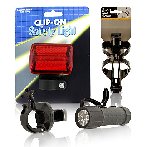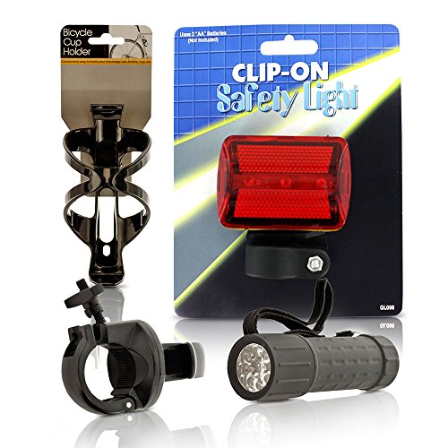 Studio : Athletic Range Publisher : Athletic Range Product Description The clip on safety light has a three position push switch for flashing, solid on and off. It is black plastic with a red lens over lights and has a 1 screw and nut closure for the clip mount pivoting attachment. Operates on 2 AA batteries which are not included. Comes packaged in a plastic sleeve with hanging hole. The light case is 2 3/4 X 1 3/4 X 1. Light the way and stay safely seen with this super bright, weather resistant 9 LED Bicycle Light featuring 360 degree rotating angling. Lightweight and portable, this light can be used as a bike light or removed from holster and used as a flashlight. Easy to install to handlebars. Includes a nylon carrying strap for flashlight use. Requires 3 AAA batteries (not included). Stay hydrated on bicycle rides with this convenient Bottle Cage Bicycle Drink Holder. It easily attaches to bike frames to hold cans, bottles, cups and more. Modern design made of sturdy plastic with a non slip and secure hold. Lightweight and adjustable. Measures approximately 6 X 2.75 X 3.125. Comes packaged with a hanging panel. 0