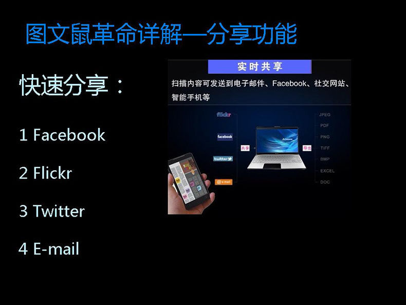 Real-time sharing: Scanned files can be sent as e-mails, SNS(Facebook, Twitter, Flickr), and via smartphones.