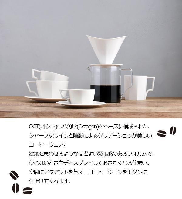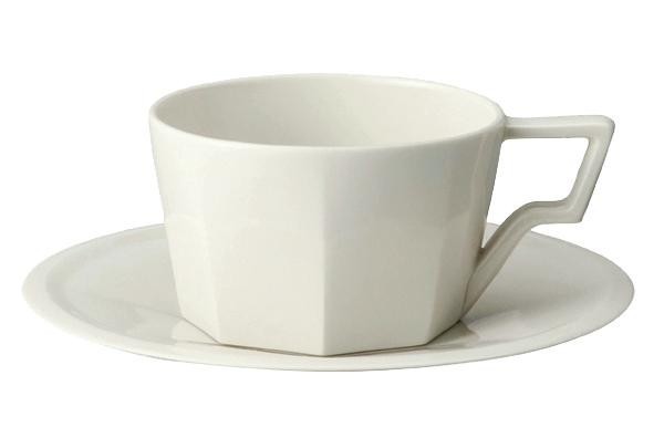 八角形をベースに構成された、シャープなラインと陰影が美しいデザインのカップ&ソーサーです。ハンドルはシャープな印象でありながら持ちやすく、カップの口縁は薄く口当たりの良い仕上げとなっています。艶やかな質感と程よい緊張感のあるフォルムで、使わないときもディスプレイしておきたくなる佇まいです。 |
