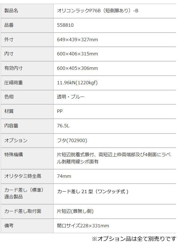 側面が透明で内容物の確認が一目で分かる!!下段のオリコンや棚を塞がない脱着式扉のオリコンラックです。 製造国:日本 ※サプライヤー直送品 ご注文後2~3営業日後の出荷となります【商品名】三甲 サンコー オリコンラック(扉付オリコン) P76B(短側扉あり)-B 透明/ブルー 558810