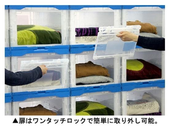側面が透明で内容物の確認が一目で分かる!!下段のオリコンや棚を塞がない脱着式扉のオリコンラックです。
