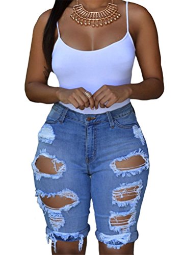 -. Title : Nicetage Women’s High Waist Ripped Bermuda Short Jeans Stretchy Destroyed Midi Denim Shorts