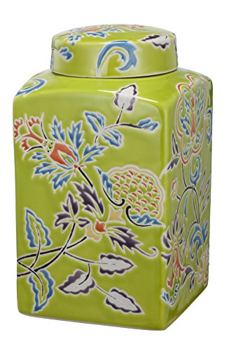 - Material: 100% Ceramic Hand painted Measures 8"x4.5"x5" tall , 3 inch opening, weighs 2 lbs, green base color with blue, coral red, purple floral pattern chic Cloisonné Lidded jar and the lid does remove. Smooth ceramic, embossed each piece is hand made and might have slight variations.