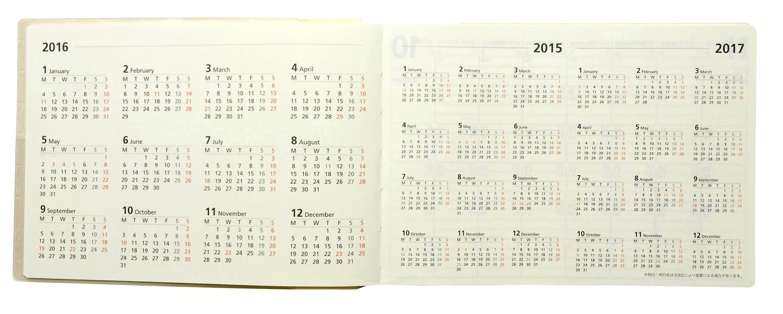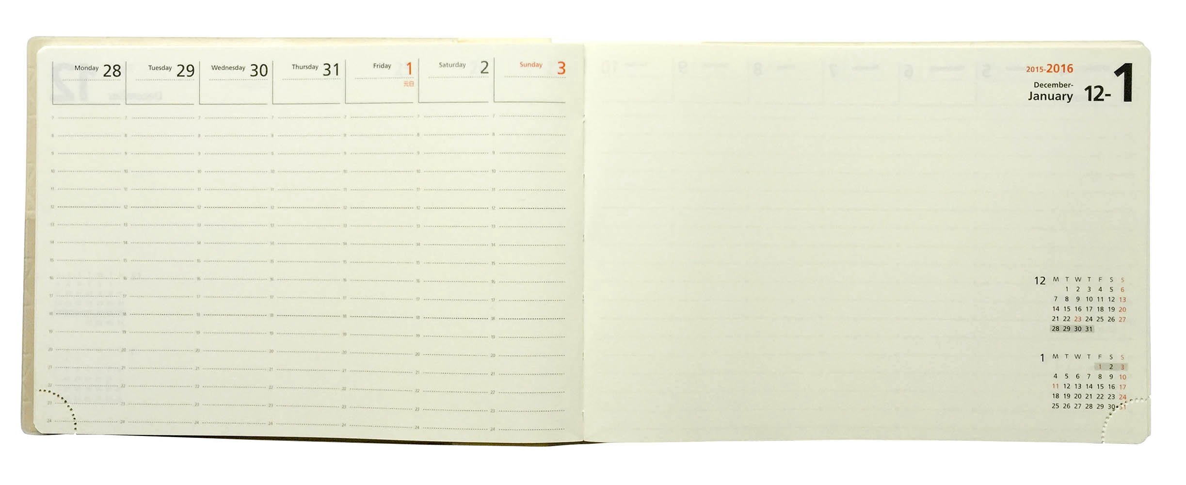 The left page is a weekly schedule and the right page is the free memo layout with high degree of freedom.