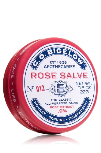-. Binding : Misc. -. Brand : C.O. Bigelow -. Color : Red -. EAN : 0637293071259 -. Feature : Rose Salve #12 factory sealed .8oz / lsified with extra-soothing rose extract, to help ease irritation and condition the skin / May be used on lips, face, cuticles, elbows, knees, chapped or very dry skin patches / Pat on anytime as needed to care for lips or anything that needs a fix / Developed by Bigelow chemists, not tested on animals -. Label : Bath & Body Works -. Manufacturer : Bath & Body Works -. MPN : 2616631 -. NumberOfItems : 1 -. PackageQuantity : 1 -. PartNumber : 2616631 -. ProductGroup : Beauty -. ProductTypeName : BEAUTY -. Publisher : Bath & Body Works -. Studio : Bath & Body Works -. Title : C.O. Bigelow Rose Salve 22g/0.8oz -. UPC : 637293071259