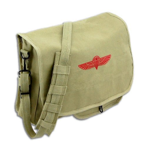-. Feature : Authentic reproduction Israeli Army shoulder bag issued to paratroopers for carrying essentials / Lots of practical, lightweight & durable storage for books, papers, folders and other personal gear / Roomy 3-pocket interior compartment, separate map pocket with storm flap, pen/pencil holders / Aged-look heavyweight cotton canvas in British Khaki with red paratrooper wings, adjustable strap / Snap-ring flap closure, dual hanging rings on back; 15"W x 11"H x 4"D, 2.2 lbs. Comes with official Army Universe Pin.