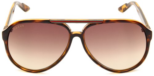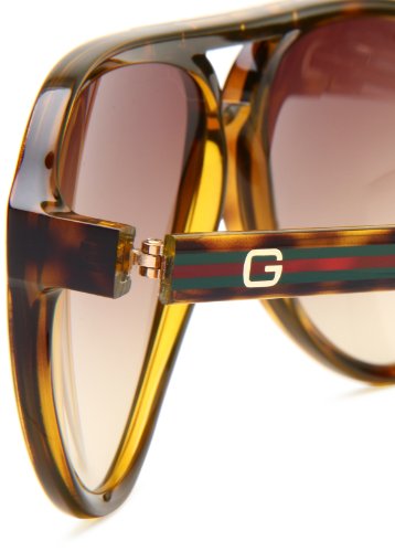 Gucci Sunglasses style GG1627 is a plastic aviator with contrast detailing on the double bridge. The Rx-able GG1627 features a saddle nose bridge and adjustable wire core temples for maximum comfort. The temples feature the Gucci Sunglasses logo. Gucci Sunglasses have lightweight scratch/impact-resistant lenses.