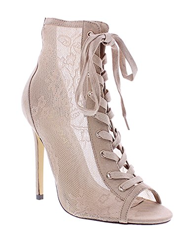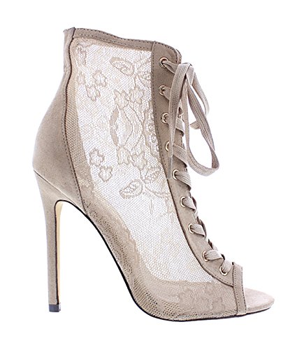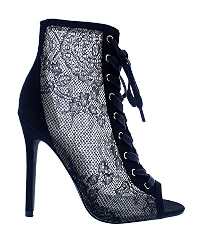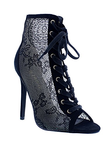 Product Description These sexy booties are made with a peep toe, ace up front and lace mesh side panels. Also made with a single sole, stiletto heel and self tie closure. 0