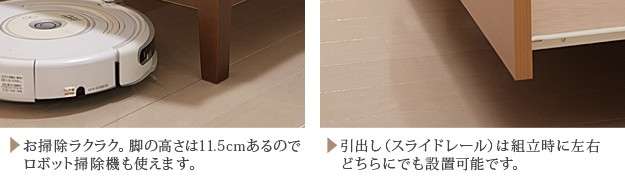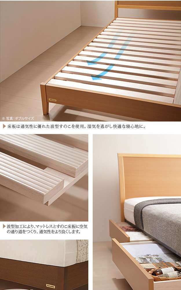 ●商品について:【床板部分がすのこ仕様のベッドです】床板部分がすのこなので通気性が抜群です。脚付なのでお掃除に便利。お掃除ロボットも使用できます。薄型引出しは左右どちらにも取り付けられます。引出しはスライドレール付き。