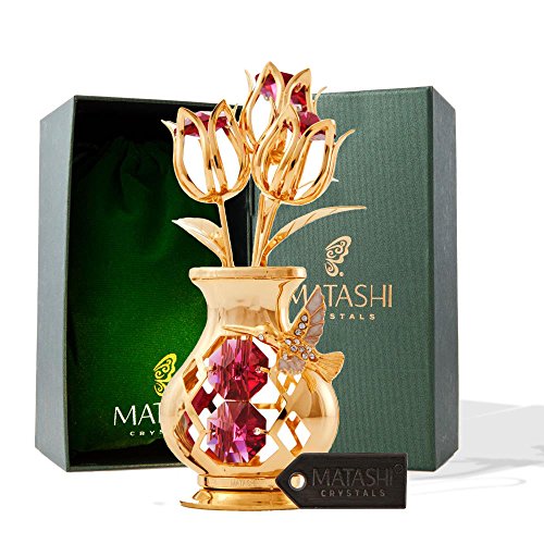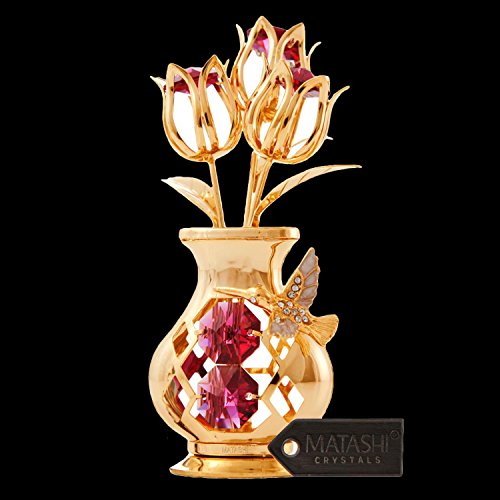 Mothers Day Gift – Crystal Studded Flowers in a Vase Ornament, Beautifully Crafted with 24K Gold, Red Crystals & Decorative Hummingbird - Mothers Gifts - Great Gift Idea for Mom by Matashi