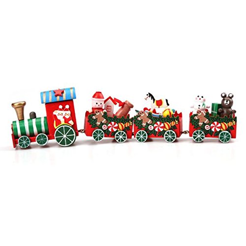 Specifications: 100% brand new and high quality Material:Wood Color:Colorful Engine and Carriages are linked with brass fixings and cannot be seperated. This a rocky road train and does not sit flat on a surface-better displayed on fake snow or similar Length: 24.5cm Package content: 1set Christmas train 0