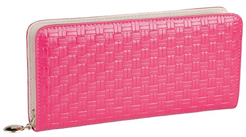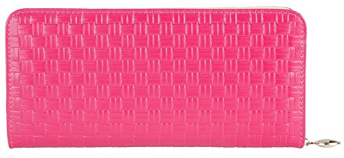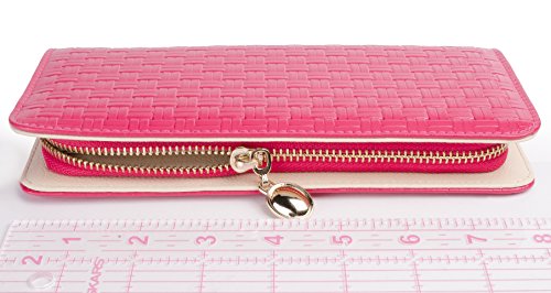 Women's Genuine Leather Zipper Clutch Wallet with Panama Weave Pattern (Pink)
