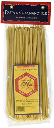 -. Binding : Misc. -. Brand : Pastai Gragnanesi -. EAN : 8002399001318 -. Feature : 17.6 ounce (500 gram) - Plastic Packing / Ingredients: Durum Wheat Semolina and Water / IGP Protected - Protected Geografical Information / The Italian Pasta di Gragnano is chewier, nuttier and more rough textured than most supermarket brands / Product of Italy -. IsAdultProduct : 0 -. Label : Alma Gourmet -. Manufacturer : Alma Gourmet -. MPN : 6999327 -. PackageQuantity : 1 -. PartNumber : 6999327 -. ProductGroup : Grocery -. ProductTypeName : GROCERY -. Publisher : Alma Gourmet -. Studio : Alma Gourmet -. Title : Spaghetti alla chitarra Pasta di Gragnano 500 gr