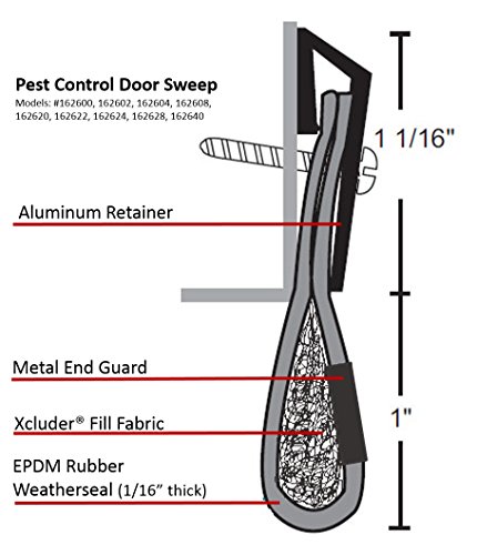 -. Feature : Sweeps can be cut to length for an exact fit / Mouse Proof / Rat Proof - The outer rubber gasket is filled with Xcluder, a blend of stainless steel wool and poly fibers that is impenetrable to rodents, providing two layers of protection for your home or business / Easy to install / Ideal for: Home, Restaurant, Hotel/Motel, Food Production / Distribution facilities, Schools & Daycare / Solid aluminum frame with durable neoprene rubber seal / Includes stainless steel mounting screws and instructions / Patent Pending / Height: 2" - Suitable for under door gaps of up to .75 inches.