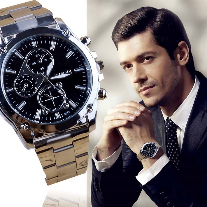【仕様】アナログ表示 クォーツ(電池式) 三つ折れ※電池入り+替えの電池1個(使用開始時は側面のリューズを押してください。)【素材】バンド:ステンレススチールベルトケース:合金【サイズ】腕回り:約190mm~211mmバンド幅 :約20mm文字盤直径:約45mm文字盤厚み:約10mm重量:約80g商品発送時は、動作確認用の電池が内蔵されております。使用開始時は、側面のリューズ(つまみ)を押して下さい。電池の残量につきましては、製造時期により差が生じますのでご了承下さい。付属の新品電池は、電池交換の際にご使用下さい。※クロノグラフ、ストップウォッチ機能につきましては飾りとなっております。※箱・説明書・保証書は付属しておりません。※バンド交換の際は、お近くの時計店までよろしくお願い致します。※ステンレスバンドのコマ外しはできない仕様になっております。※製造時期により予告なく、若干の仕様変更がある場合がございます。※ご使用のPC環境により実際の商品と色味が異なって見える場合がございます。 ご了承、よろしくお願い申し上げます。