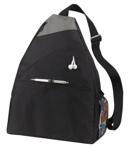 This multipurpose large Sling Backpack with Ipod port is perfect for an active person. Backpack has a front open pocket, mesh pocket, and adjustable shoulder straps. Size 12" W x 17.5" H x 6" G Strap up to 40"