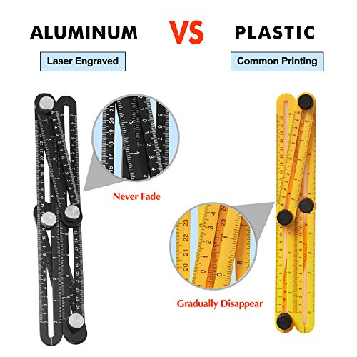 - ► LASER ETCHED & DUAL-CALIBRATED ARMS. All the arms of Genround multi-angle ruler are laser etched, compared to most others with common printing that you could easily scrape the scale off, laser's more permanent and last forever. It's also dual-calibrated in inches and metric measures. You are able to re-assemble the angleizer arms to provide inner/outer sides with whichever scale suits your requirements.