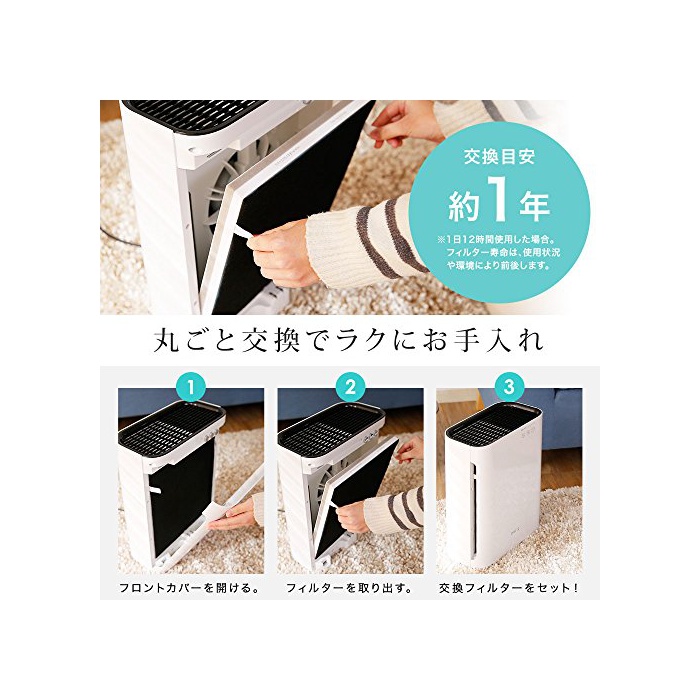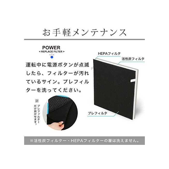 【필터】HEPA필터 ※0.1μm이상의 미세 입자를 99.985%제거 ※세척 불가 교환식 ※필터 교환 기준:약4,320시간(사용 빈도에 의해 약반년~1년 정도) 【포장 사이즈】폭36.7x(길이)깊이20.5x높이45cm(약4.8kg)