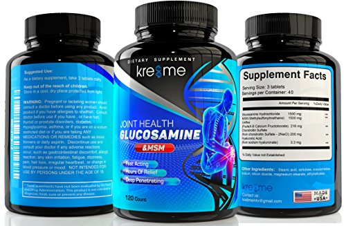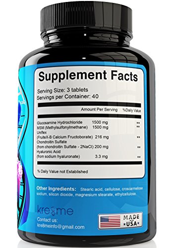 Kre8me Glucosamine with MSM provides 1500mg of glucosamine sulfate, 200mg Chondroitin, 3.3mg of hyaluronic acid and 216mg of FruiteX-B a naturally derived anti-inflammatory in each serving. Our high potency formula gives you all the joint and muscle relief you need to live a healthy active life-in three easy to swallow tablets a day. And it comes with a 90-day money back guarantee.So kick joint and muscle stiffness to the curb. Click on the Add to Cart button to have your Kre8me Glucosamine with MSM shipped today!
