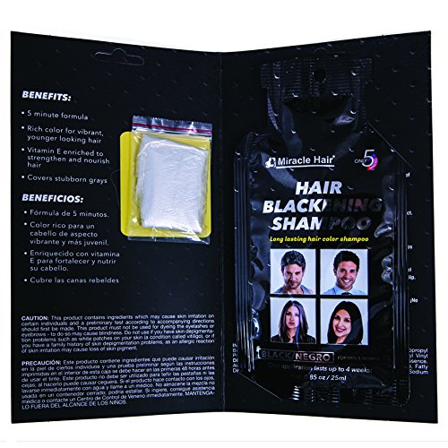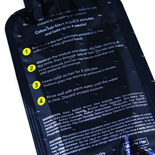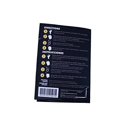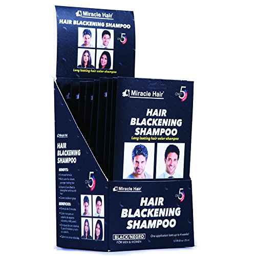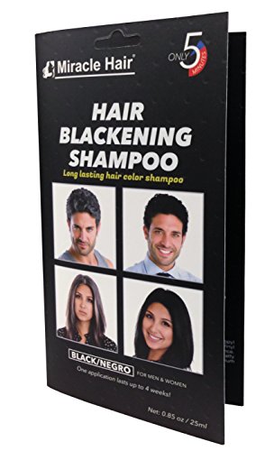 -. Binding : Misc. -. Brand : Miracle Hair -. Color : Black -. Feature : WANT TO LOOK YOUNGER IN UNDER 5 MINUTES? Try Miracle Hair Shampoo-In Hair Color in Real Black / NATURAL LOOKING FULL COVERAGE OF EVEN YOUR MOST STUBBORN GRAYS! / VIBRANT AND BOLD "Real Black" color takes years off of your appearance in just minutes! / SPLIT POUCH TECHNOLOGY means NO drips, NO mess, NO problems! / LONG LASTING up to 6 weeks, or until your gray grows back! -. IsAdultProduct : 0 -. Label : Evergreen Research and Marketing -. Manufacturer : Evergreen Research and Marketing -. MPN : HBS37001 -. PackageQuantity : 12 -. PartNumber : HBS37001 -. ProductGroup : Beauty -. ProductTypeName : BEAUTY -. Publisher : Evergreen Research and Marketing -. Studio : Evergreen Research and Marketing -. Title : Hair Blackening Shampoo (12-pack) by Miracle Hair