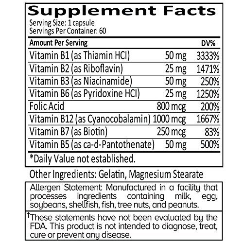 Our natural B-Complex supplement contains essential nutrients that help convert food into fuel. It's this fuel that energizes our body throughout the day. Each capsule contains multiple B-Vitamins that has its own specific benefits. From promoting healthy skin and hair to preventing memory loss and migraines, the daily benefit of taking a B-Complex supplement can vastly improve your health. • Vitamin B1 (Thiamin) is essential for a healthy nervous system as well as good muscular function. • Vitamin B2 (Riboflavin) promotes healthy skin and good vision. • Vitamin B3 (Niacin) helps the digestive system function properly. • Vitamin B5 (pantothenic acid) helps boost the immune system and improve athletic performance. • Vitamin B6 (pyridoxine) aids brain function. • Vitamin B7 (biotin) prevents and treats biotin deficiency associated with pregnancy, malnutrition, and rapid weight loss. • Vitamin B9 (folic acid) is crucial for a healthy pregnancy. • Vitamin B12 (cobalamin) works to keep your central nervous system healthy. Boost your energy and get more out of life. Order your B-Complex supplement today!Feature