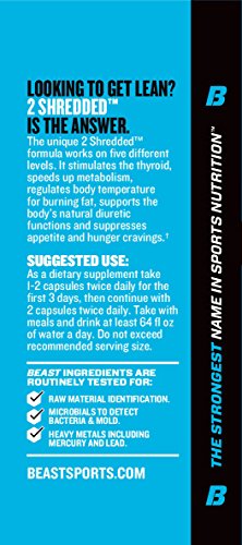 ReleaseDate : 2016-09-05 Studio : Beast Sports Nutrition Publisher : Beast Sports Nutrition Binding : Health and Beauty Product Description The unique 2 Shredded formula works on five different levels. It supports the thyroid, speeds up metabolism, modulates body temperature for burning fat (thermogenesis), supports the body's natural diuretic functions and finally, supports craving control. 0