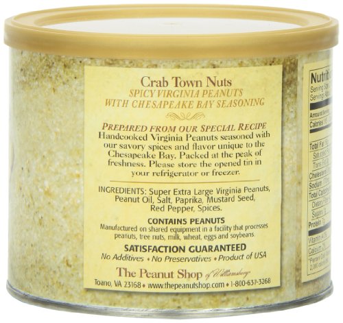 -. Binding : Grocery -. Brand : The Peanut Shop of Williamsburg -. EAN : 0053136898966 -. Feature : Distinctively unique and different And unbelievably crisp / Our same Super Extra Large Handcooked Virginia Peanuts are lightly seasoned in a variety of flavors / Try a tin for yourself and give several as gifts to those you wish to receive the finest -. Label : The Peanut Shop of Williamsburg -. Manufacturer : The Peanut Shop of Williamsburg -. Model : 89896 -. MPN : 89896 -. NumberOfItems : 1 -. PackageQuantity : 1 -. PartNumber : 89896 -. ProductGroup : Grocery -. ProductTypeName : GROCERY -. PublicationDate : 2012-04-26 -. Publisher : The Peanut Shop of Williamsburg -. Size : 10.5 Ounces -. Studio : The Peanut Shop of Williamsburg -. Title : The Peanut Shop of Williamsburg Crab Town Nuts, 10.5-Ounce Tin -. UPC : 053136898966