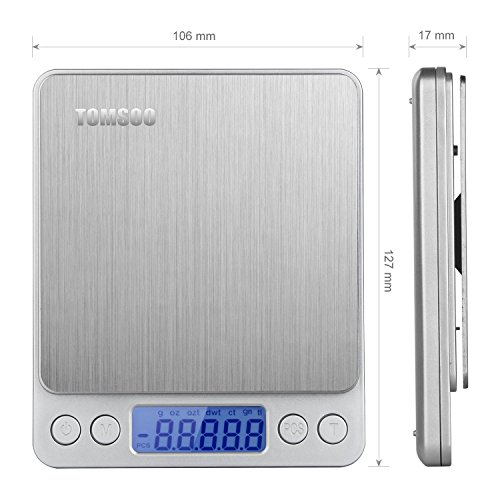 TOMSOO 0.01oz/0.1g 3kg Electronic Balance Digital LCD Display Pro Pocket Scale, Accuracy Kitchen Scale, Mini Food Scale, Auto Off and Back-lit, Tare & PCS Functions, Stainless Steel (Silver)